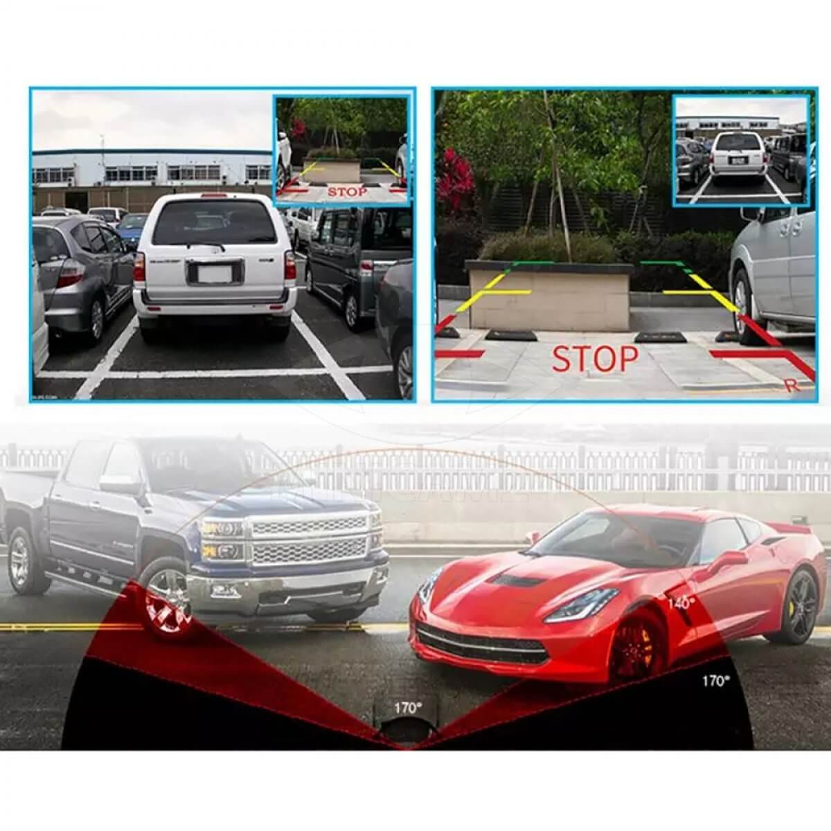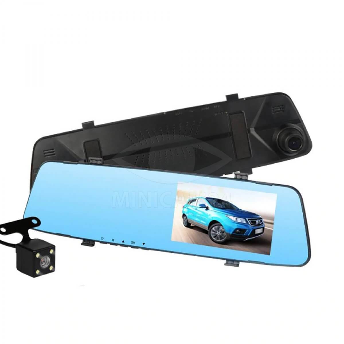 Видеорегистратор совмещающий функции салонного зеркала заднего вида с двумя видеокамерами с обзором в 170 градусов. Разрешение видео 1080Р. Камера заднего вида выводит изображение на сенсорный экран, встроенный в зеркало. Камеры оборудованы светодиодами инфракрасной подсветки для съемки ночью. Запись видео производится на карту памяти. Предусмотрена кольцевая запись. Питание от бортовой сети автомобиля.